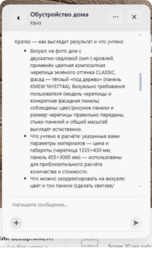 Ассистент Ai отвечает на основе вашей базы знаний, помогает клиенту разобраться в вариантах, стоимости и деталях проекта — без ожидания ответа менеджера.